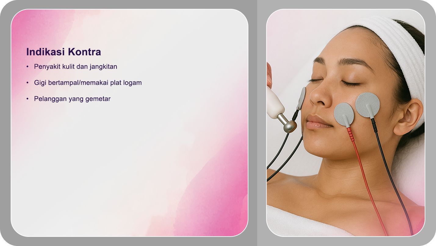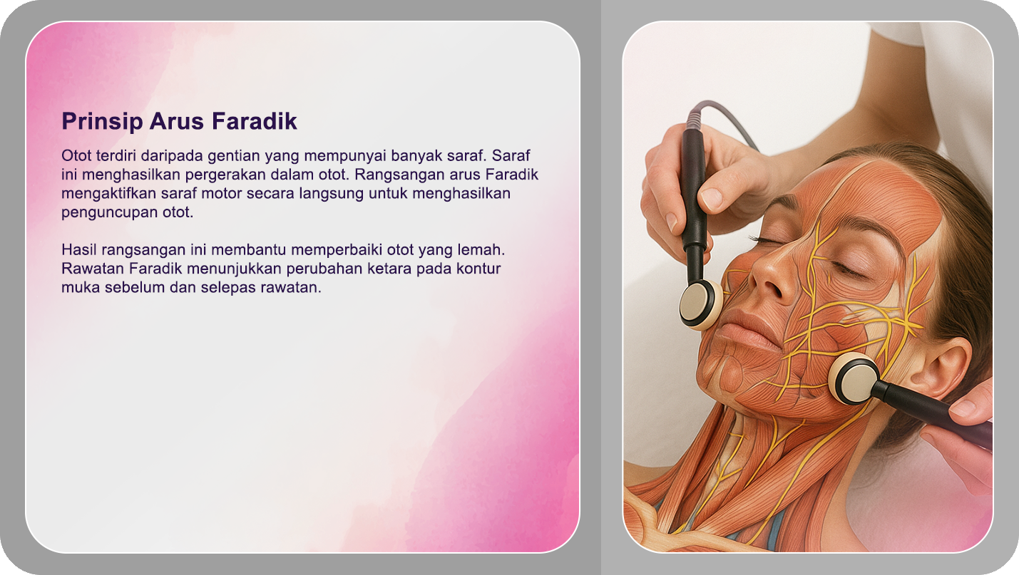 Dermatologi profesional menggunakan arus micro current muka untuk menguatkan epidermis dan menyambung semula serat dan pengeluaran kolagen di dalamnya terutama pelanggan yang berumur selepas 40 tahun. Prosedur rawatan ini merangsang otot bagi memperbaiki kontur muka.